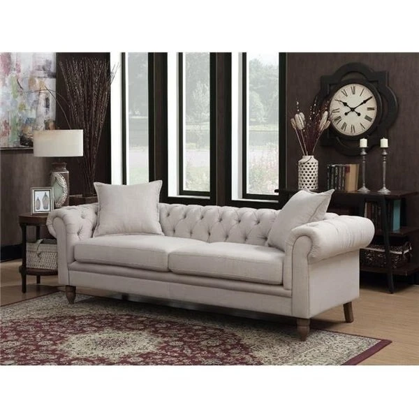 Express your exquisite sense of style and taste with this classic tufted Chesterfield sofa designed for your apartment or home. Showcasing rolled arms. soft linen blend upholstery. and firm yet comfortable foam padding. this beautiful sofa will provide plenty of support for entertaining and relaxation. The vintage styling. modern weathered wood legs and 2-cushion design enables you to make a statement while creating the look you want. SpecificationsColor: BeigeCollection: JulietMaterial: Linen FabricChesterfield Sofa Dimension: 29" H x 85" W x 34" LWeight: 155 lbs