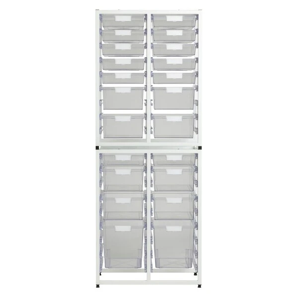 Double Column Wall Unit – Slim Line – High-Capacity Storage Wall Unit in White with 12 x Crystal Clear -3” Slim Line Trays, 8 x Crystal Clear -6" Slim Line Trays and 2 x Crystal Clear -12" Slim Trays Unit frame finish is White, lid finish is White and supplied with 12 x Crystal Clear -3” Slim Line Trays, 8 x Crystal Clear -6" Slim Line Trays and 2 x Crystal Clear -12" Slim Trays Tote Trays are reversible and feature our unique duel labeling system. Labels and shields are available for the front of the tray, the E-Z Peel Labeling feature on the back of the trays allow any adhesive labels to be removable. The use of high-capacity storage solutions within grade level storage or resource rooms enable learning environments to be free of clutter, supporting highly mobile activities within these environments while reducing square footage requirements. Sturdy Construction: Front and rear fully welded, 1” square, 16-gauge steel tube frames with baked-on epoxy finish. Top panels constructed from 18-gauge formed steel sheets with baked-on epoxy finish. Glide & Tilt® structural runners, moulded from engineering grade ABS, secured to steel tube frames. Frames nested utilizing fluted coated steel metal frame connectors and wall brackets for safety. Units fitted with adjustable feet. Optional Mounting Brackets are supplied with each wall Unit. Two sets of Mounting Brackets included with each wall unit for the option of fixing to a Wall if needed. Mounting screws are not included. Dimensions: 28 3/4′′ W x 75 1/2′′ H x 17′′D