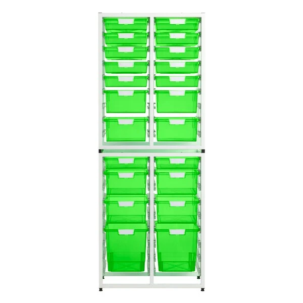 Double Column Wall Unit – Slim Line – High-Capacity Storage Wall Unit in White with 12 x Neon Green -3” Slim Line Trays, 8 x Neon Green -6" Slim Line Trays and 2 x Neon Green -12" Slim Trays Unit frame finish is White, lid finish is White and supplied with 12 x Neon Green -3” Slim Line Trays, 8 x Neon Green -6" Slim Line Trays and 2 x Neon Green -12" Slim Trays Tote Trays are reversible and feature our unique duel labeling system. Labels and shields are available for the front of the tray, the E-Z Peel Labeling feature on the back of the trays allow any adhesive labels to be removable. The use of high-capacity storage solutions within grade level storage or resource rooms enable learning environments to be free of clutter, supporting highly mobile activities within these environments while reducing square footage requirements. Sturdy Construction: Front and rear fully welded, 1” square, 16-gauge steel tube frames with baked-on epoxy finish. Top panels constructed from 18-gauge formed steel sheets with baked-on epoxy finish. Glide & Tilt® structural runners, moulded from engineering grade ABS, secured to steel tube frames. Frames nested utilizing fluted coated steel metal frame connectors and wall brackets for safety. Units fitted with adjustable feet. Optional Mounting Brackets are supplied with each wall Unit. Two sets of Mounting Brackets included with each wall unit for the option of fixing to a Wall if needed. Mounting screws are not included. Dimensions: 28 3/4′′ W x 75 1/2′′ H x 17′′D