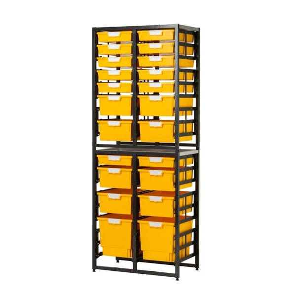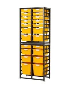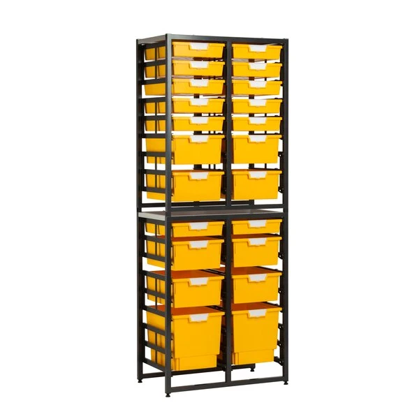 Double Column Wall Unit – Slim Line – High-Capacity Storage Wall Unit in Black with 12 x Primary Yellow-3” Slim Line Trays, 8 x Primary Yellow-6" Slim Line Trays and 2 x Primary Yellow-12" Slim Trays Unit frame finish is Black, lid finish is Gray and supplied with 12 x Primary Yellow-3” Slim Line Trays, 8 x Primary Yellow-6" Slim Line Trays and 2 x Primary Yellow-12" Slim Trays Tote Trays are reversible and feature our unique duel labeling system. Labels and shields are available for the front of the tray, the E-Z Peel Labeling feature on the back of the trays allow any adhesive labels to be removable. The use of high-capacity storage solutions within grade level storage or resource rooms enable learning environments to be free of clutter, supporting highly mobile activities within these environments while reducing square footage requirements. Sturdy Construction: Front and rear fully welded, 1” square, 16-gauge steel tube frames with baked-on epoxy finish. Top panels constructed from 18-gauge formed steel sheets with baked-on epoxy finish. Glide & Tilt® structural runners, moulded from engineering grade ABS, secured to steel tube frames. Frames nested utilizing fluted coated steel metal frame connectors and wall brackets for safety. Units fitted with adjustable feet. Optional Mounting Brackets are supplied with each wall Unit. Two sets of Mounting Brackets included with each wall unit for the option of fixing to a Wall if needed. Mounting screws are not included. Dimensions: 28 3/4′′ W x 75 1/2′′ H x 17′′D