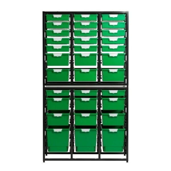 Triple Column Wall Unit – Slim Line – High-Capacity Storage Wall Unit in Black with 21 x Primary Green-3” Slim Line Trays, 12 x Primary Green-6” Slim Line Trays and 3 x Primary Green-12” Slim Line Trays Unit frame finish is Black, lid finish is Gray and supplied with 21 x Primary Green-3” Slim Line Trays, 12 x Primary Green-6” Slim Line Trays and 3 x Primary Green-12” Slim Line Trays Tote Trays are reversible and feature our unique duel labeling system. Labels and shields are available for the front of the tray, the E-Z Peel Labeling feature on the back of the trays allow any adhesive labels to be removable. The use of high-capacity storage solutions within grade level storage or resource rooms enable learning environments to be free of clutter, supporting highly mobile activities within these environments while reducing square footage requirements. Sturdy Construction: Front and rear fully welded, 1” square, 16-gauge steel tube frames with baked-on epoxy finish. Top panels constructed from 18-gauge formed steel sheets with baked-on epoxy finish. Glide & Tilt® structural runners, moulded from engineering grade ABS, secured to steel tube frames. Frames nested utilizing fluted coated steel metal frame connectors and wall brackets for safety. Units fitted with adjustable feet. Optional Mounting Brackets are supplied with each wall Unit. Two sets of Mounting Brackets included with each wall unit for the option of fixing to a Wall if needed. Mounting screws are not included. Dimensions: 42 5/8′′ W x 75 1/2′′ H x 17′′D