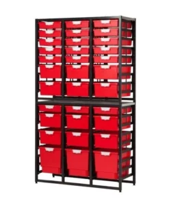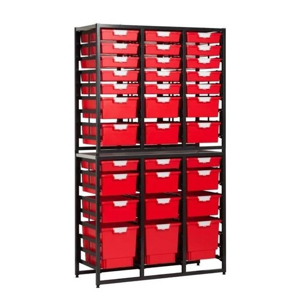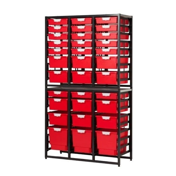 Triple Column Wall Unit – Slim Line – High-Capacity Storage Wall Unit in Black with 21 x Primary Red-3” Slim Line Trays, 12 x Primary Red-6” Slim Line Trays and 3 x Primary Red-12” Slim Line Trays Unit frame finish is Black, lid finish is Gray and supplied with 21 x Primary Red-3” Slim Line Trays, 12 x Primary Red-6” Slim Line Trays and 3 x Primary Red-12” Slim Line Trays Tote Trays are reversible and feature our unique duel labeling system. Labels and shields are available for the front of the tray, the E-Z Peel Labeling feature on the back of the trays allow any adhesive labels to be removable. The use of high-capacity storage solutions within grade level storage or resource rooms enable learning environments to be free of clutter, supporting highly mobile activities within these environments while reducing square footage requirements. Sturdy Construction: Front and rear fully welded, 1” square, 16-gauge steel tube frames with baked-on epoxy finish. Top panels constructed from 18-gauge formed steel sheets with baked-on epoxy finish. Glide & Tilt® structural runners, moulded from engineering grade ABS, secured to steel tube frames. Frames nested utilizing fluted coated steel metal frame connectors and wall brackets for safety. Units fitted with adjustable feet. Optional Mounting Brackets are supplied with each wall Unit. Two sets of Mounting Brackets included with each wall unit for the option of fixing to a Wall if needed. Mounting screws are not included. Dimensions: 42 5/8′′ W x 75 1/2′′ H x 17′′D