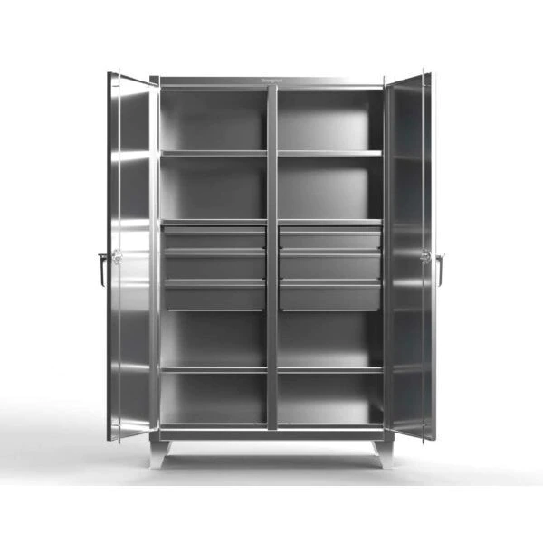 Combination Wardrobe, Heavy Duty, Cabinet Height Range Full Height, Cabinet Door Type Standard, Assembled, Height of Cabinet 78 in, Width of Cabinet 60 in, Depth of Cabinet 24 in, Method of Construction Welded, Number of Cabinet Shelves 6, Shelf Capacity 825 lb, Number of Doors 2, Cabinet Color Stainless Steel, 12 Gauge, Locking Cabinet Yes, 3 Points Locking Points, Cabinet Locking Mechanism Padlock Hasp, Cabinet Handle Style Swing, Inside Drawer Depth 19 7/8 in