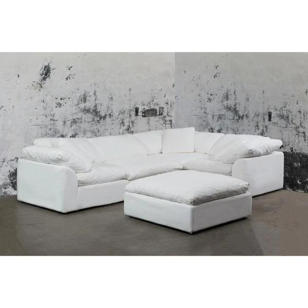 Sunset trading cloud puff collection is truly as comfortable as it looks. Close your eyes. imagine you are floating on a cloud. enjoy this feeling of total relaxation in your home. loft or apartment with this cool sectional collection. The contemporary low frame makes this sleek sectional sofa ideal to bring your open living spaces together. So versatile. instead of a futon in your dorm. spare bedroom or home office. feather pillow top seating supported by inner springs make this as cozy as a bed. Build your own. modular left or right facing corner. armless and ottoman allow you to create the ultimate laidback lounge that conforms to your room. Perfect for kids. pets and parties. unexpected spills will roll off the washable soft fabric slipcovers. This collection is simply the best family room furniture ever. Features5 PieceComfortable. easy to clean slipcovers that will continue to look as good as the day you bought itHeavy duty. yet soft to the touch. our moisture repellant 98 percent polyester/2 percent nylon fabric is "breathable adding an extra degree of comfortState of the art technology prevents moisture penetration from reaching the back of the fabric as well as the cushionsEvery fiber is wrapped in environmentally friendly "c6 stain resistance protection that lasts generations. keeping your fabric clean. even from your pet's little accidents. muddy feet or if your child drops a juice box on the seatDeep seating sofa sectional with plush cushions and state of the art stain resistant fabricWhite is always right. make your home look open and brightFoam encased frame with muslin coverFrame constructed from select hardwood and furniture-grade plywood with strong corner blocked joineryAll wood is kiln-dried to remove moisture and prevent cracks or warpsFor maximum comfort. top 8 inches of arms and backs are firmly formed with sturdy 1.8 Density foamPocket spring construction: sixty steel bands with nylon webbing encased in varying compression 1.8 Density foam make the foundation as comfortable as a bedBack and seat cushion covers have same fabric on both sides and can be flipped to minimize wearDouble-stitched slipcovers and pillows for extra durabilityIncludes 24 pillow and zippered same fabric coverResilient 50/50 feather fiber blend cushions are channel-sewn into several compartments to assure even back and seat supportDouble layered feather proof liningFinished upholstery on all sides. allowing for use as standalone or end piecesSquare shape allows you to switch configuration from left arm facing to right arm facingSolid neutral finish 1.5 Wood feet with plastic floor protectorsMachine washable. toss dry on low heat to remove wrinkles. Spot clean with mild soap and water. To prevent overall soiling. vacuum or brush lightlySpecificationsColor: WhiteCorner Wedge Overall (with Cushions): 36" H x 44" W x 44" DSeat (at Cushion Top) 20" HSeat (floor to Cushion Seam) 16" HSeat (floor to Frame) 12" HBack & Arm Cushions: 24" H x 36" WSeat Cushion 36" D x 36" WInside Seat (without Arm & Back Cushions): 36" D x 36" WInside Seat (with Back & Arm Cushions): 28" D x 28" WInside Back (with Seat Cushion): 6" HInside Back (without Seat or Back Cushion): 12" HArm: 24" HArm (with Seat Cushion): 6" HInside Arm (without Seat Cushion): 12" HWeight: 531.5 lbs