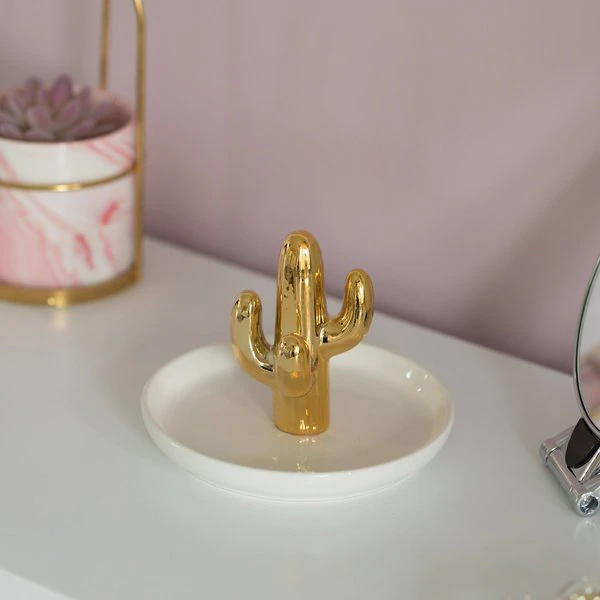 <p>Add a touch of art to your jewelry organization with this plate statue figurine. It is made of sculptured ceramic cactus figurine with a gold shiny color. This trinket holder keeps your jewelry items accessible and beautifully displayed. Ideal for living room, bedroom, tabletop, office desktop, cabinets, nightstands, or mantelpiece. You may use it as an eye-catching decorative ornament or as a jewelry holder to display your rings. The rings slide onto the branches of the cactus and stores multiple rings of various sizes. Put it on the nightstand to place your rings as you get ready for bed or collect your rings while you wash your hands. This ring holder will surely add an artistic design wherever you place it!</p><ul><li>DIMENSIONS: 5" Diameter x 4" High</li><li>DECOR: Use it as a decorative ornament or as a jewelry holder to display your jewelry</li><li>MATERIAL: Crafted with a sturdy high quality ceramic material for a long lasting durability</li><li>MULTIUSE: You may use it as an accent piece, accessory dish, or jewelry holder</li><li>DISPLAY: Suitable for a tabletop, desktop, kitchen, vanity, bedroom, or bathroom</li></ul>