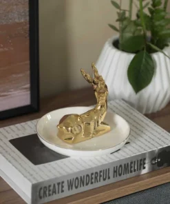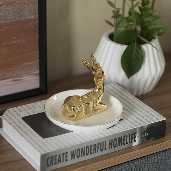 <p>Add a touch of art to your jewelry organization with this plate statue figurine. It is made of sculptured ceramic deer figurine with a gold shiny color. This trinket holder keeps your jewelry items accessible and beautifully displayed. Ideal for living room, bedroom, tabletop, office desktop, cabinets, nightstands, or mantelpiece. You may use it as an eye-catching decorative ornament or as a jewelry holder to display your rings. Put it on the nightstand to place your rings as you get ready for bed or collect your rings while you wash your hands. This ring holder will surely add an artistic design wherever you place it!</p><ul><li>DIMENSIONS: 4.5" Diameter x 4" High</li><li>DECOR: Use it as a decorative ornament or as a jewelry holder to display your jewelry</li><li>MATERIAL: Crafted with a sturdy high quality ceramic material for a long lasting durability</li><li>MULTIUSE: You may use it as an accent piece, accessory dish, or jewelry holder</li><li>DISPLAY: Suitable for a tabletop, desktop, kitchen, vanity, bedroom, or bathroom</li></ul>