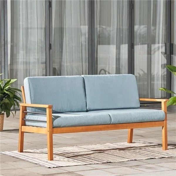 Whether you would love to make an outdoor space to hang out with friends on a Sunday afternoon or stretch out with a good book. this Gloucester Contemporary Patio Wood 2-Seater Sofa is perfect to add extra sitting area to your patio so your neighbors are comfortable. Relax on the gentle cushion made from high-quality water-resistant polyester. these extra thick cushions are made from high-quality. water-resistant polyester and have added inches in length to make your sitting most comfortable. Crafted from solid Eucalyptus Hardwood and slatted design. this natural wood sofa club chair is a perfect weather-resistant option for your outdoor living. SpecificationsDimension: 60 x 31 x 29 in.Weight: 56 lbs