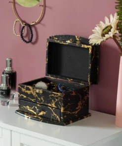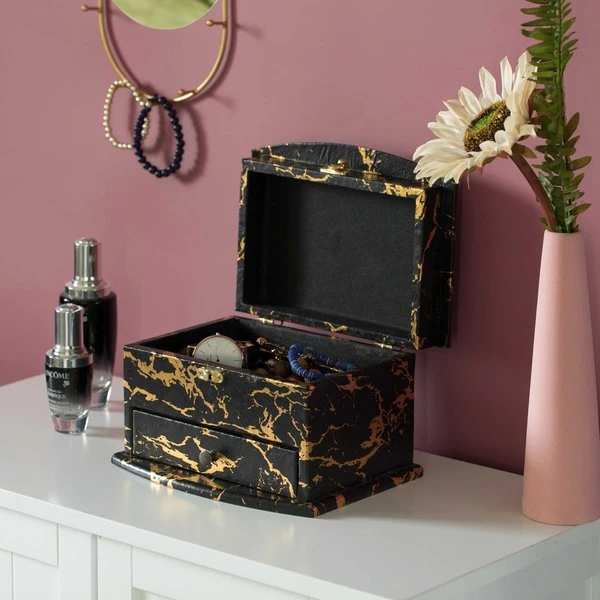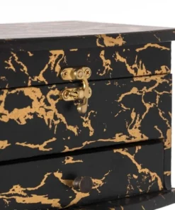 <p>A perfect jewelry chest to organize your assortments. Reveals a drawer on the bottom and a lifting top with a latch to keep your jewelry safe. Has a black lining to protect your valuables. It can also use as a decorative storage box with its modern black and gold marble design.</p><ul><li>SIZE: 8.25" W x 6" D x 5" H</li><li>FEATURES: A drawer and a lifting top with a latch to keep your jewelry safe</li><li>TREASURE CHEST: Kids can also use this type of box for their little treasures and toys</li><li>DESIGN: Modern black and gold marble design</li><li>INCLUDES: Has a black lining for protection</li></ul>
