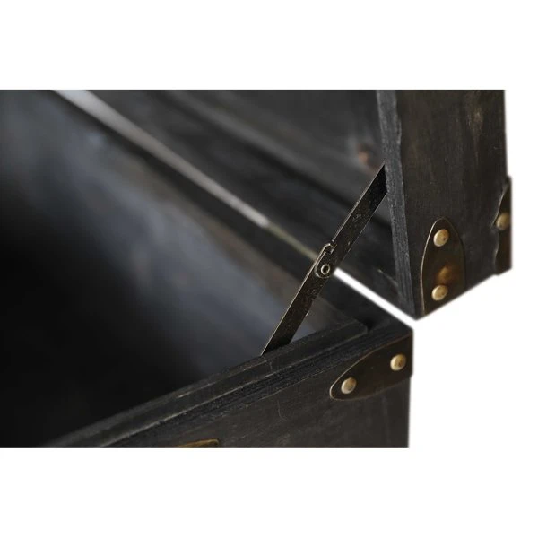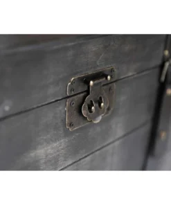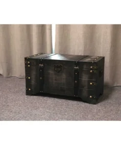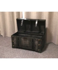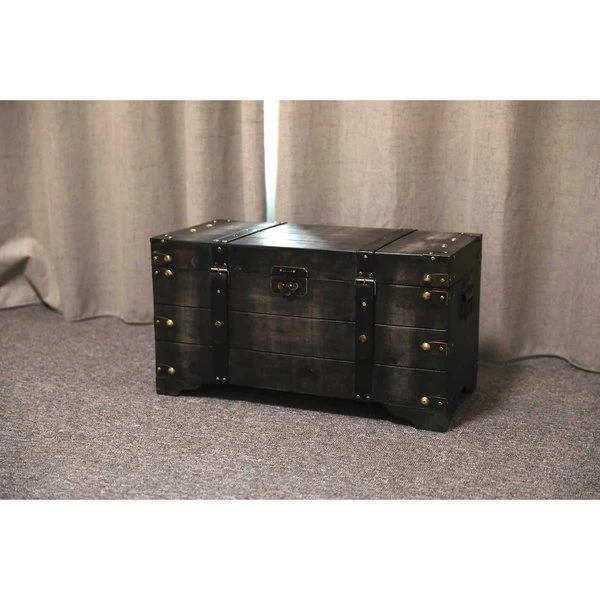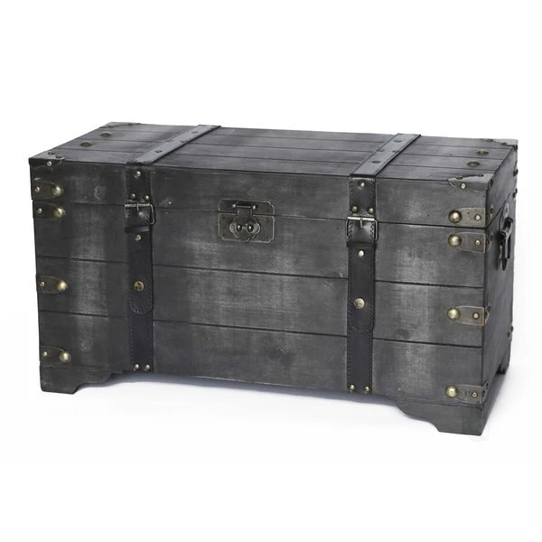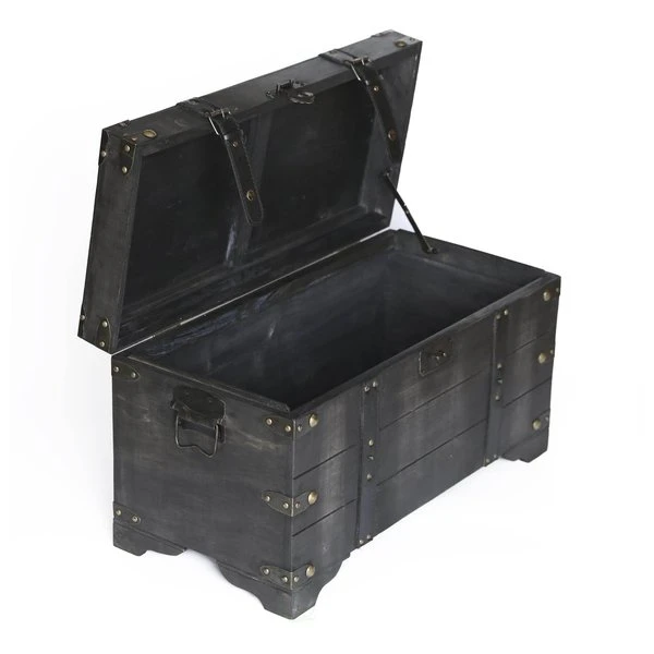 Evoke a Victorian-era feel in your home with the Vintiquewise Distressed Black Medium Wooden Storage Trunk. Faux leather straps, along with antiqued nailhead trim, add a touch of old-fashioned charm to the distressed stained wood surface. Perfect for storing books, blankets, and more.Overall Dimensions: 25.5 W x 12 D x 13.75 H Interior Dimensions: 24 W x 10.25 D x 9 H +2 for lid.