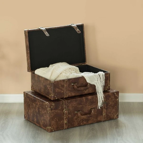 Add astonishing appeal and vintage style to your home décor with this beautiful set of storage trunks. Superbly crafted in wood and faux leather, these trunks are truly wonderful work of art. Designed to use independently or as a set, its perfect for storing trinkets, mementos, and various collections. Studded detail, carry handle, and side straps adds to its antique look. Place them anywhere to meet your storing needs and give your interior décor an innovative and distinctive flair by adorning it with these fully practical decorative trunks. Declutter and Decorate!