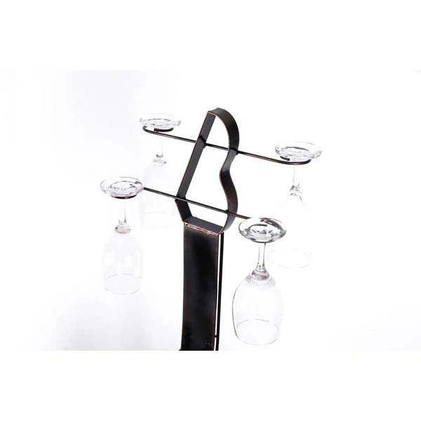 Complete the decor of your room with this vintage guitar wine holder. Composed out of durable wood and metal material, this wine holder offers durability and practical function for continual use. Vintage wood and metal designed base and guitar shape create a decorative appeal to your room decor. Freestanding design keeps the wine stand steady and your wine collection secure and use the top rack to keep glasses. For wine and music lovers, this guitar shaped wine holder invites electric/vintage vibes to your home bar decoration.