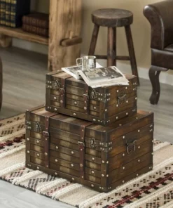 These sturdy trunks look fabulous as a decorative accent, stacked beside a sofa or chair, and can also be displayed individually on a shelf, dresser, desk, or beneath a glass coffee table. Each nesting trunk offers great storage and features practical handles, making them easy to carry from one location to another. These trunks can hold everything from clothing and books to small electronics and documents. Can hold up to 40 lbs.