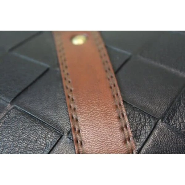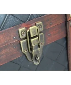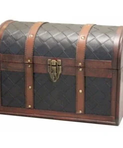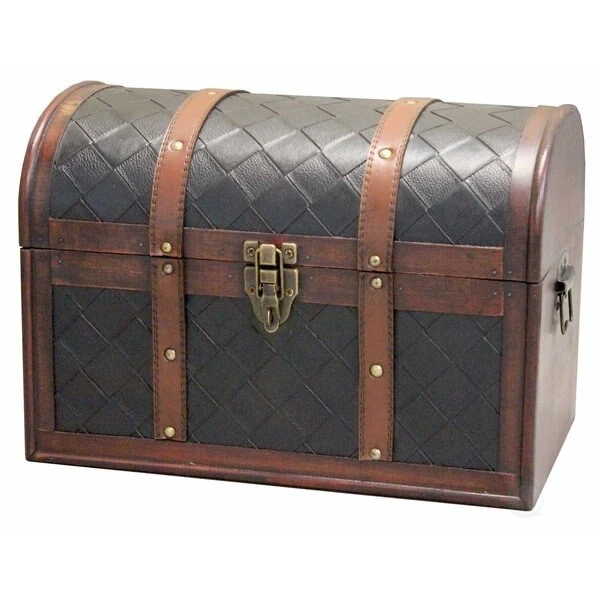 This Leather Round Top Trunk is the perfect storage solution. It's decorated with black leather, arranged in a quilted pattern. There are two brown leather straps running across the front to enhance its beauty. A handle at each side assures easy lifting.