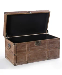 Make your living room feel warm and inviting with this wooden trunk. Studded detail, wooden design, and rustic latch gives your decor collection a rustic spin. Composed out of distressed wood this trunk offers a sturdy holder to keep bedroom or living room items organized . Plus, lined interior and lockable latch provides protection to keep trunk content secure for storage. Declutter and decorate!