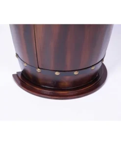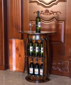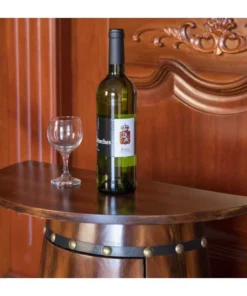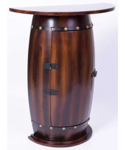 This wooden barrel-shaped wine rack console end table will add a final touch to your dining room or wine cellar. Designed to be used in living space as well as storage areas, it provides convenient and practical storage as well as classic elegant style. Freestanding design keeps the bar table steady and your wine collection secure. Use it to store wines or liqueur in the cabinet or display glasses on the top. For bonus protection, the cabinet is secured with a lockable latch.