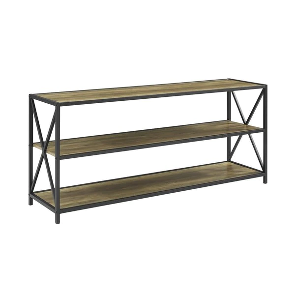 Showcase your books. magazines. media. and more with this beautiful bookshelf. Durably constructed of high-grade MDF and powder coated metal. together they create sturdy. yet stylish shelving unit. The simple x-frame design is the perfect accentuation for any room in your home. FeaturesX-Frame Metal and Wood Console TableSpecificationsColor: Rustic OakSize: 60 in.Weight: 60 lbs