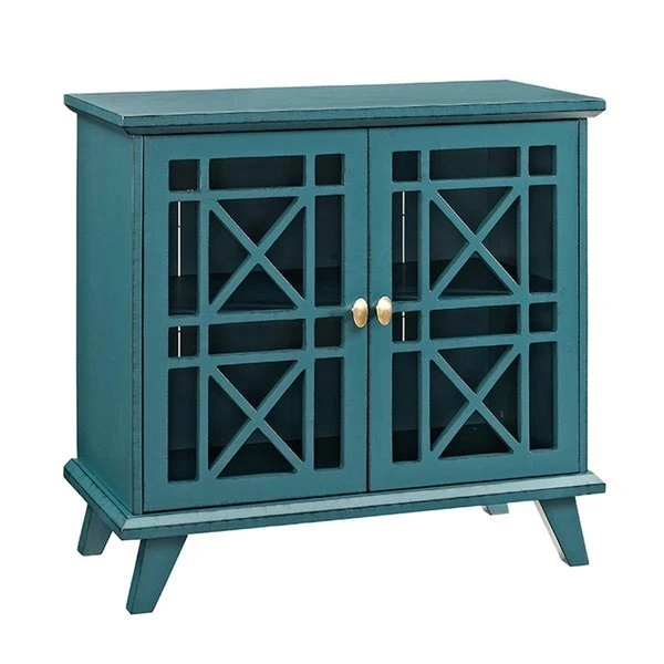 Highlight your home with this decorative accent console. the fretwork doors add for an intriguing design for a look that is sure to please. Features an adjustable shelf to house your favorite d cor and accessories. This combination of practical and ornamental create a beautiful accent console that will complement any living room. dining room. bedroom. or hallway. FeaturesDistressed DetailingSimple PullsTapered LegsThe contour lines of the tapered legs exude elegance and sophisticationSolid wood and high-grade MDF (Medium Density Fiberboard) with wood veneerPerfect for the kitchen. hallway. bedroom. living or dining roomBurnished and distressing edgesFretwork design doorsSpecificationsColor: BlueShape: RectangularTop Material: WoodMaterials: Solid Wood. High-Grade MDF. Wood VeneerNumber of Shelves: 2Number of Doors: 2Size: 32 in.Dimensions: 32 H x 32 W x 16 L in.Weight: 64 lbs