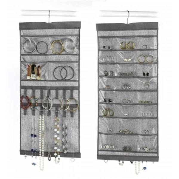 Hangs from closet rod.Swivel hook allows for easy access to both sides.For storage. organization and protection of jewelry and other small valuables.28 see-through pockets.14 Cloth Tie loops for necklaces and bracelets.Double sided fabric.Gray