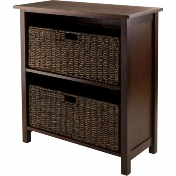 Granville Storage Shelf with Foldable Baskets is perfect to storage and organized your goodies. This set comes with shelf and two large foldable baskets in chocolate color made from corn husk. Shelf assembled size is 28"W x 13"D x 30"H. Shelf is made from combination of solid and composite wood. Foldable corn husk basket is 22.83"W x 10.24"D x 9.06"H when open and folded is at 31.69"W x 9.45"D x 2.36"H.